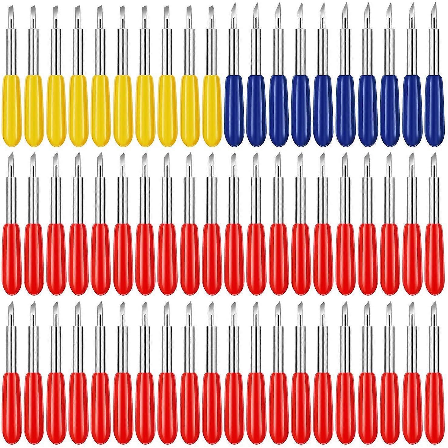 [ Materials]it is , not easy to rust, than other blades on the market, and can cut your project smoothly. It can last for a long time. [Perfect Compatibility] The fixed-point blade is compatible with most cutting machines, suitable for most paper cutting browsing air, browsing air 2 vinyl cutting machine [Applications]light to medium weight materials, such as flash paper, sticky foil and computer paper, particleboard, seal material, thick card,Vinyl Blade Whether it's creating cards, , personalized gifts, Christmas party wall decoration. [Usage]The blades are packed inside the rubber cover, To avoid scratching your fingers, please pull them out off the cover when used. Please test the cutting effect after setting appropriate cutting depth. 30 degrees Blades: Used for cutting window , film and rice paper. 45 degrees Standard Blades: Used for cutting glitter paper. 60 degrees Blade: Used for cutting magnet, chipboard, stamp material. Colour:Red+yellow+blue Material:Cemented carbide Size:About 2.5*0.5cm Overall Length : 23mm Shank Diameter:2mm Package Contents: 60 x 45 degrees blades 20 x 30 degrees blades 20 x 60 degrees blades Only the above package content, other products are not included. Note: Light and different displays may cause the color of the item in the picture a little different from the real thing. The measurement allowed error is +/- 1-3cm.