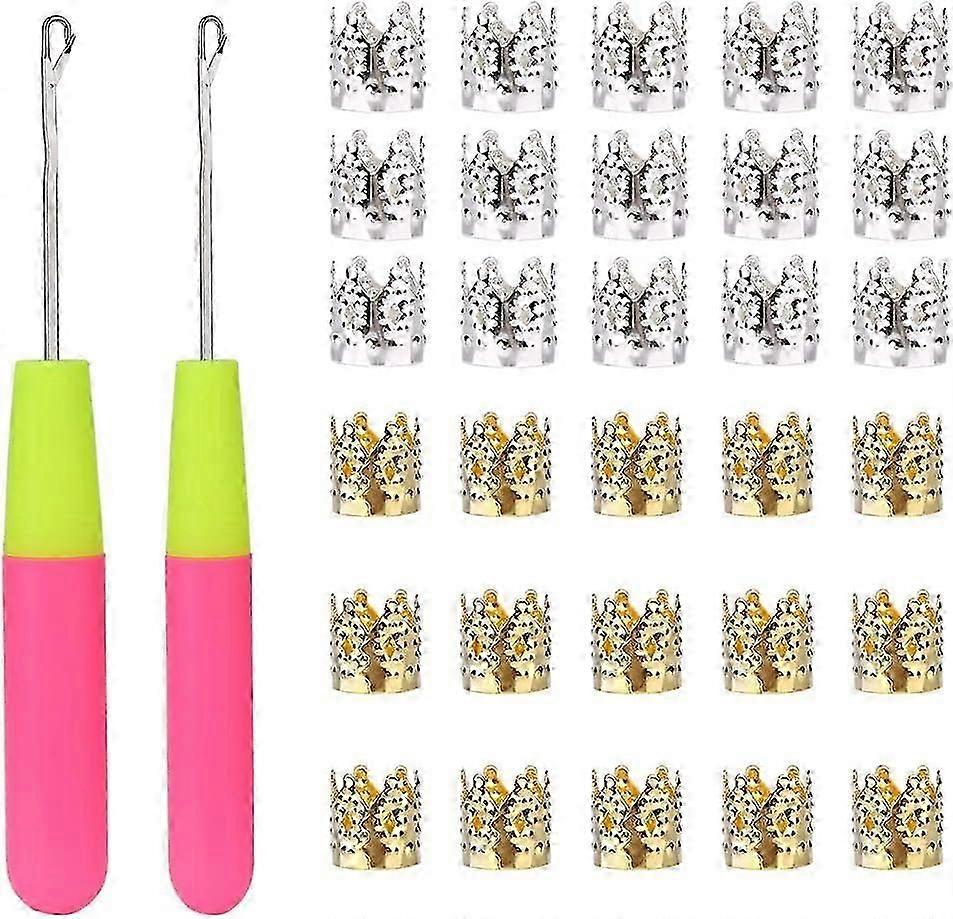 2 PCS Latch Hook Crochet Needle + 30 PCS Dreadlocks Hair Ring Decoration Braiding Hair Silver Gold Metal