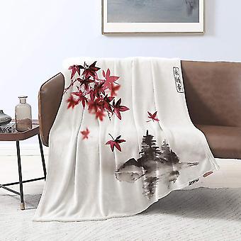 Flannel Blankets,red Japanese Maple Leaves And Island Pine Trees In Fog On Rice Traditional Oriental Ink,throws For Sofa Fluffy Blanket Bed Throw F Be