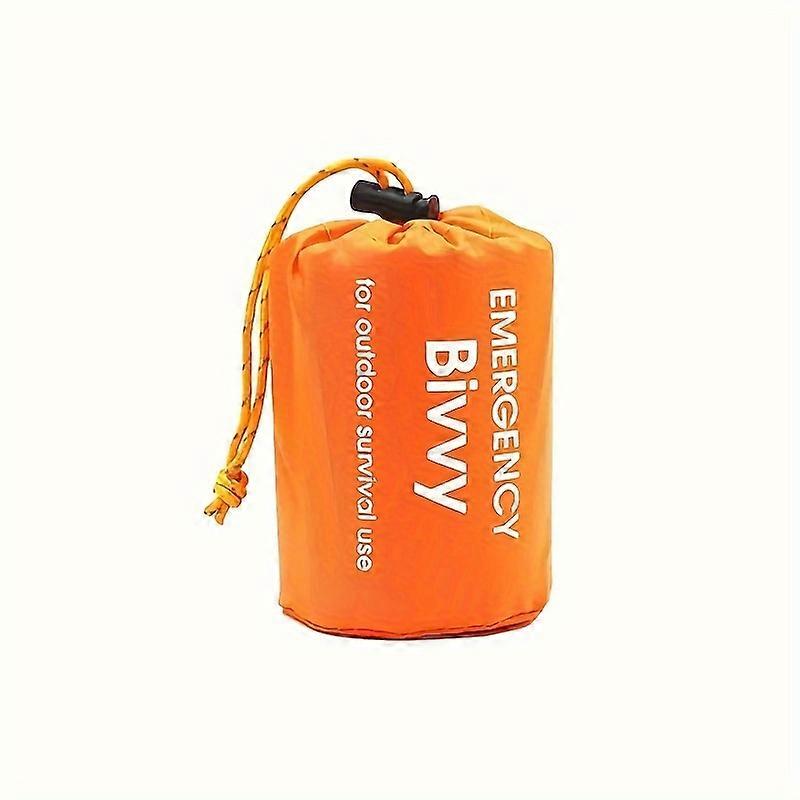 Insulated emergency sleeping bag, reusable & compact w/ whistle. PE material, drawstring. For outdoor & first aid.