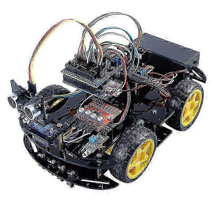 Creative Gift for Kids This creative robot toy can help children who are interested in programming to carry out in-depth learning, allowing them to better understand programming and electronics, and at the same time improve their hands-on and problem-solving skills.Perfect gift for boys and girls on Birthday|Children's Day. Smart Robot Car, Easy to Assemble Intelligent and Educational Toy Car Robotic Kit for Arduino Learner,an educational STEM kit beginners (kids) to get hands-on experience about programming, electronics assembling and robotics knowledge. It is an integration solution for robotics learning and made for education. [Obstacle Avoidance] Under this mode the robot car will automatically detect obstacles ahead of it no matter which direction it is from with the ultrasonic sensors on the platform by sending waves and calculating the distance. Keep your car away from collision and enjoy the fun. [Line Tracking] The line tracking modules at the bottom of the car make sure it follows the runway you design with its infrared transmitter tube and an infrared receiver tube. Make sure your runway is clear enough and long enough then you can enjoy a wonderful car racing show. [IR remote] There is an IR remote controller for you to navigate the robot car run in different directions. Note: Due to the light and screen setting difference, the item's color may be slightly different from the pictures. Please allow slight dimension difference due to different manual measurement. Sold by-YJL official store