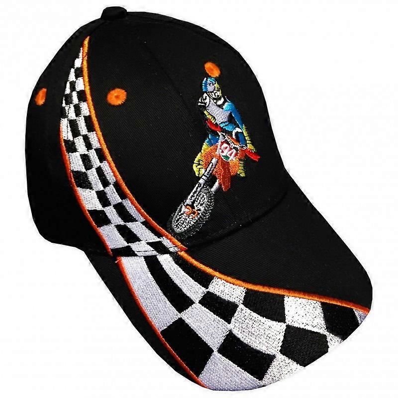 Fräck keps i svart som har broderade detaljer med en orange cross framtill och texten "Crossförare" baktill. Längs med kepsens högra sida av skärmen löper en schackrutig svart/vit border upp mot knappen som är på huvudets mitt. Finns i 3 st olika storlekar och lätta att anpassa till sitt barns huvud med ställbar kardborre bak. Det är inte alltid så lätt att få de mista barnen att vilja behålla kepsen på i syfte för att skydda sig mot solen - med denna coola keps blir de inga bekymmer Det blir snabbt en favorit hos de små fordonsfantasterna. Finns i tre storlekar: XS – Ø 48cm, höjd cm, ca.1år-2år S – Ø 52cm, höjd: cm, ca.2år-3år M – Ø 55cm, höjd: cm, ca.3år och uppåt Tvättråd: Handtvätt Material: 100% bomull Färg: Svart