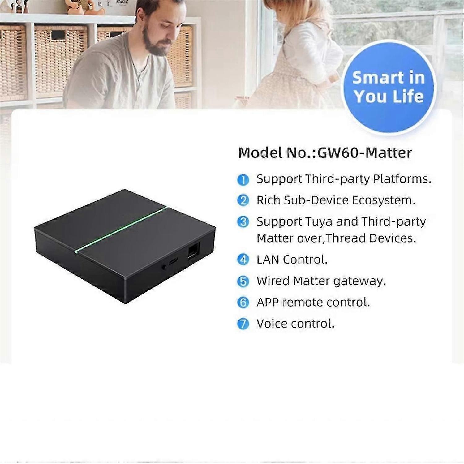 Compatible Audio & Video Equipment Style:player model number:GW60 feature:app remote control operation system:for Android camera:No Camera<br><br>use:Universal design:Rotatable app control:APP Control product type:Matter Gateway Model:GW60-Matter Power Input:5V 1A Operating Voltage:2.0 V 3.8 V Working Temperature:-10℃-55℃ Working Humidity:10%-90%RH Wireless Technology:Zigbee , Thread Network:RJ45 Colour:Black Material:ABS<br><br>Package Contents: 1 x Matter Gateway<br><br>Only the above package content, other products are not included. Note: Light reflection and different displays may cause the color of the item in the picture a little different from the real thing. The measurement allowed error is +/- 1-3cm.